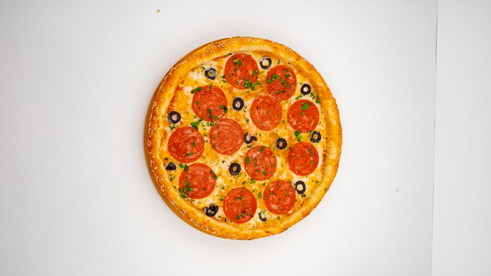 Сырный бортик, фирменный соус, пеперони халал, маслины, сыр моцарелла, орегано, зелень