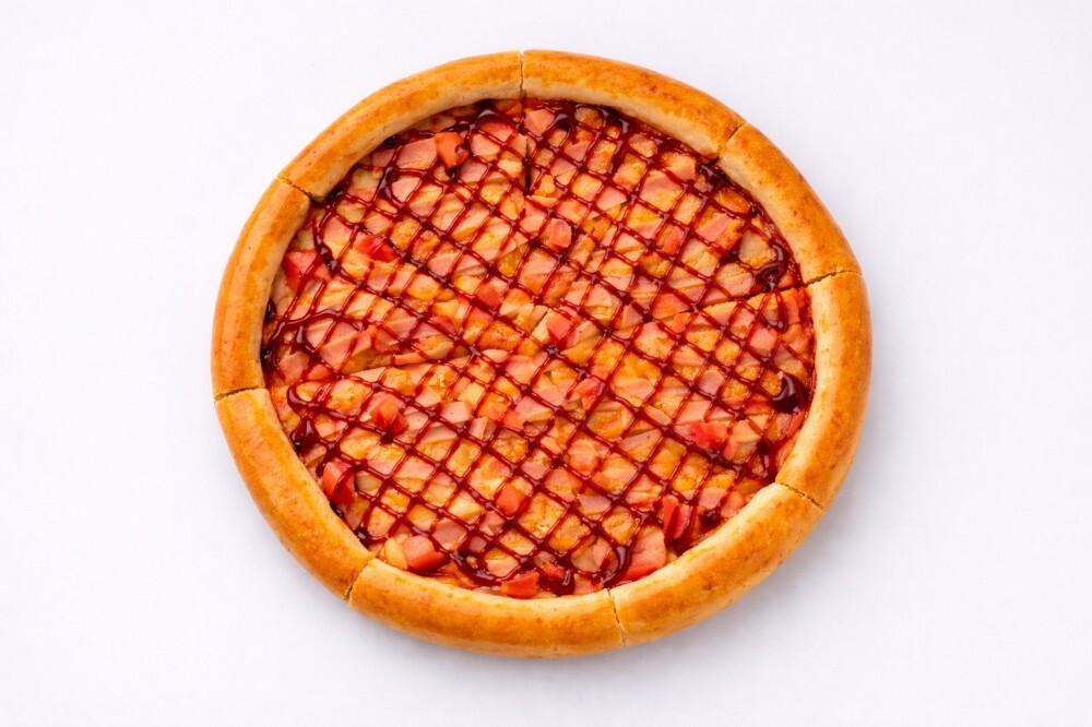 Фирменный соус, помидоры, куриный рулет, барбекю соус, сыр «Моцарелла», орегано