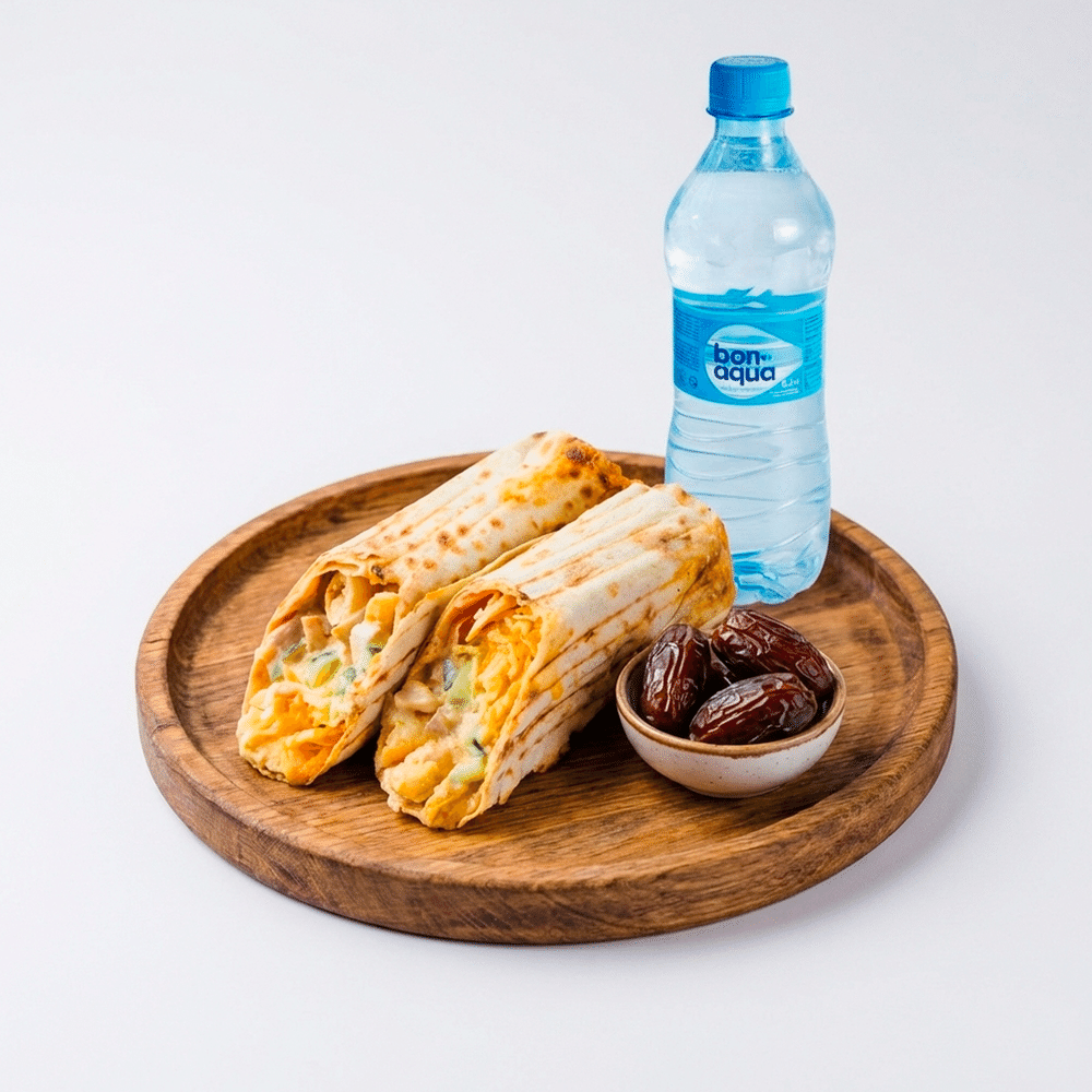 Шаурма в лаваше с курицей/с говядиной на выбор Вода без газа 0.5 л Финики 3 шт.
