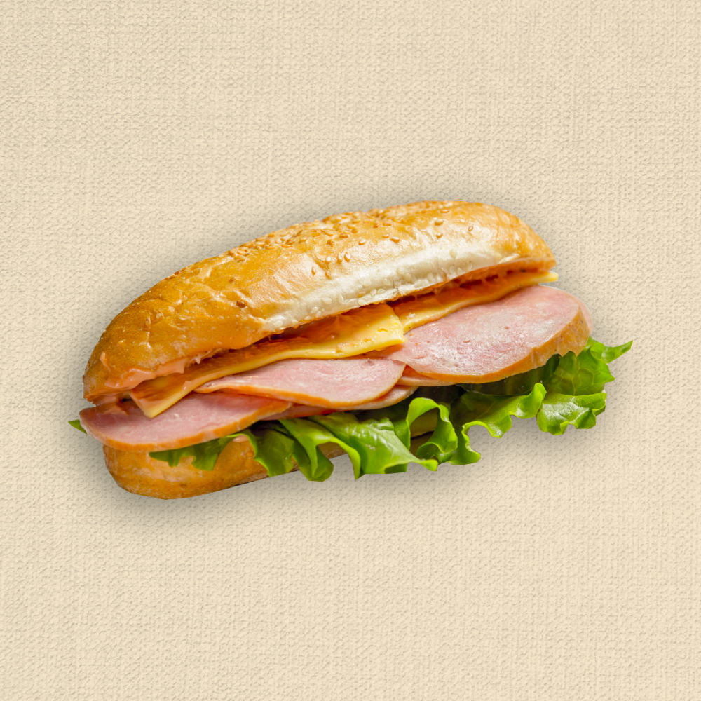 Булочка, куриный рулет халал, фирменный соус, пекинская капуста, помидор, огурец свежий, сыр Моцарелла