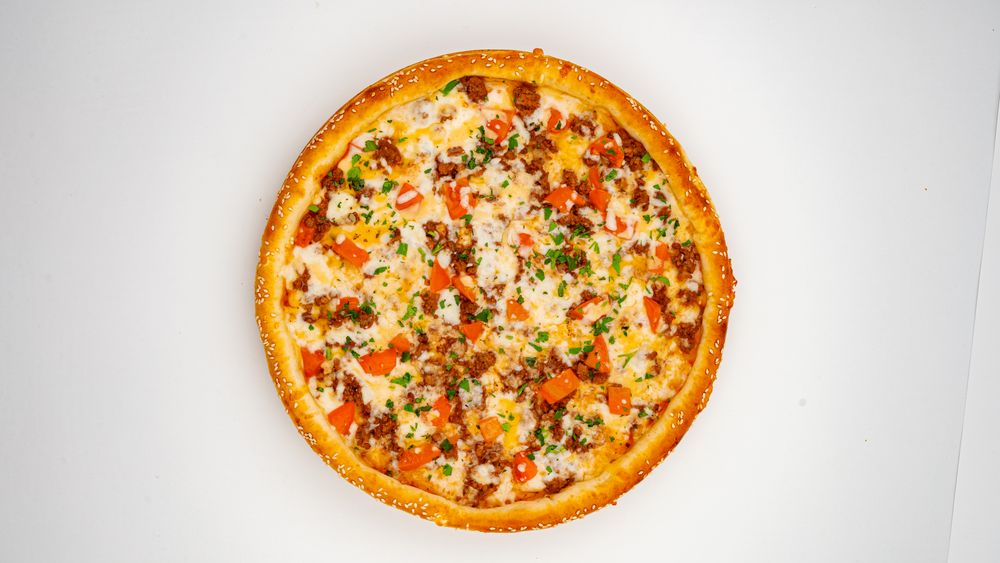 Сырный бортик, фирменный соус, фарш говяжий халал, помидоры, сыр моцарелла, орегано, зелень