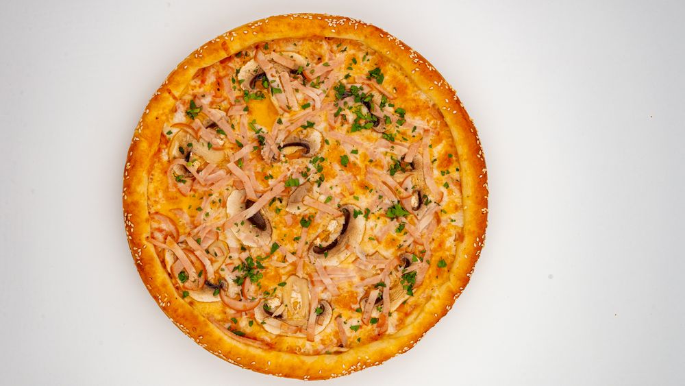 Сырный бортик, фирменный соус, куриный рулет халал, шампиньоны, сыр моцарелла, орегано, зелень