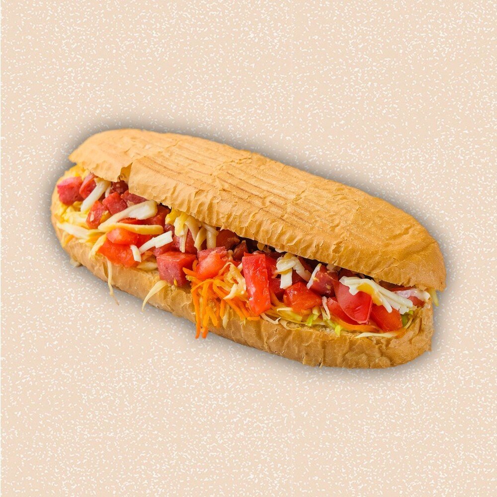 Батон, ветчина халал, помидоры, огурцы, фирменный соус, сырный соус, моцарелла, картофель фри